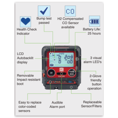 The GX-3R represents the latest evolution of gas detection technology utilizing a new generation of micro sensors. The LEL sensor has a unique design with two active filaments in one sensor to increase it’s resistance to silicone poisoning. If one filament gets poisoned the second filament takes over. The new O2 sensor is electrochemical with a 3 to 5 year life span. H2S and CO are now available in a combo micro sensor.